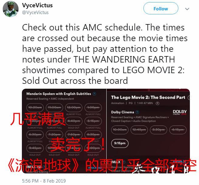 图中显示了2月8日《流浪地球》和《乐高大电影2》在美国同一家影院的上映情况。《流浪地球》不仅排片数远超后者,而且几乎所有场次的票都“已售光”,或“接近满员”。
