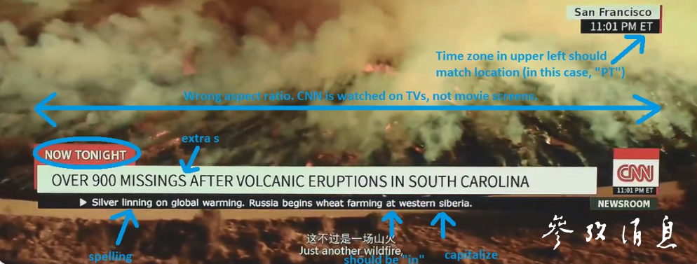 在流传很广的一张影片截图中,眼尖的外国网友挑出了几处英文拼写和语法格式的错误。