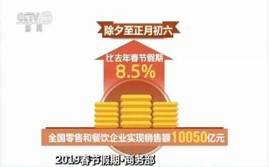 商务部2月10日发布的数据显示,2019年春节黄金周期间,全国商品市场保持平稳较快增长。除夕至正月初六(2月4日至10日),全国零售和餐饮企业实现销售额约10050亿元,比去年春节黄金周增长8.5%。