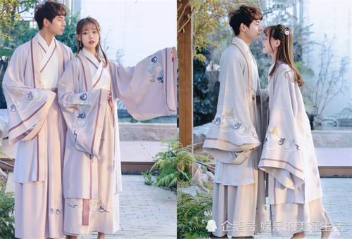 汉服版的情侣装,保留了那种古装的宽松感,宽大的衣袖和裙摆上都装饰有精致的山水刺绣,就有着一种淡雅的风情,同样的交颈加收腰设计,显得人既有时尚感又非常有韵味,这样的情侣装在身,真的是相当虐狗啊。