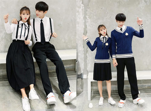这款应该是经典的校服版情侣装了,男生的白衬衫加上黑色的背带裤,再打上干练的领带,就显得整个人都非常有精神,女生也是同样的白衬衫,对应的是背带裙,上衣也是用细条的缎带打成了精巧的蝴蝶结,穿着这样款式的情侣装的话真的是青春又有甜蜜感啊。搭上深蓝色的毛衣也是非常漂亮的选择。