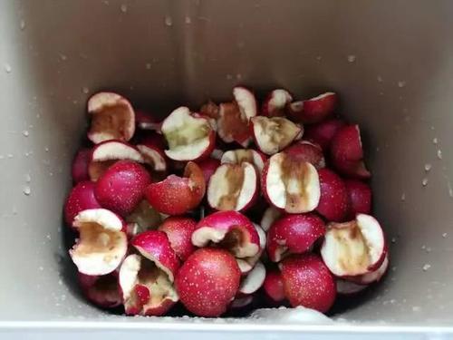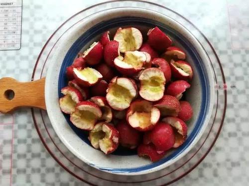 3.用山楂专用的去核神器,先在山楂的底部转一圈,然后从山楂的头部往前推,就可以把山楂果核清理出来了,清理好的山楂每个再分成2瓣