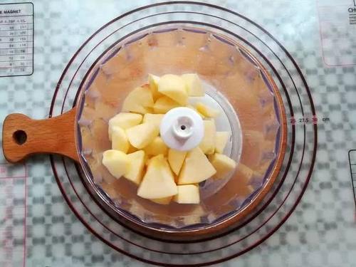 4.苹果削皮后切片用盐水泡一下防止氧化,苹果再切成小块,把苹果粒放到料理碗中,不要超过最大刻度线