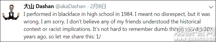2月8日,大山连发10条推特,为自己曾经“涂黑脸”扮演黑人道歉: