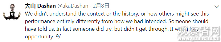 “我们那时不了解背景或历史,也不明白其他人如何用与我们的初衷完全不同的眼光看待这场表演。本应有人告诉我们的。事实上有人试过,但没有说完。那个机会被错过了。