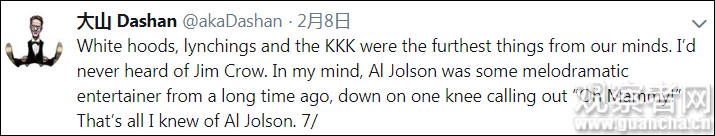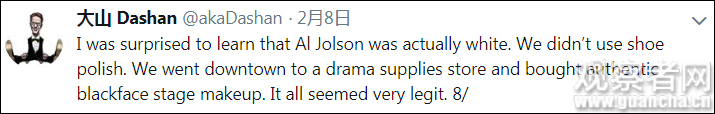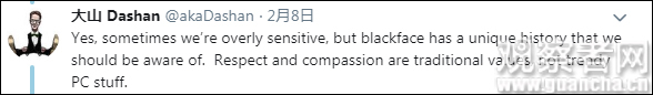 对此,大山回应称,“我们有时候是过度敏感了,但扮演黑人有特殊历史,我们应该意识到。”