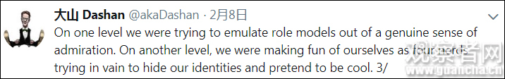 “一方面,我们是出于真诚的崇拜之意,而试图模仿这些榜样。另一方面,我们是在开自己的玩笑,因为我们四个呆子想隐藏自己的特征,假装很酷,却失败了。