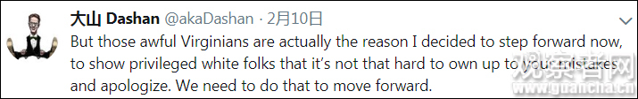 他发推表示,“那些可怕的弗吉尼亚人实际是我决定现在站出来的原因,以此向有特权的白人表明,承认错误和道歉没那么难。这样做才能前进。”