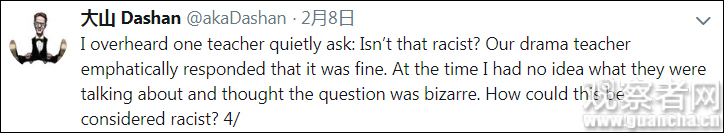“我无意中听到一位老师小声问:那不是种族主义吗?但我们的戏剧老师强调说没事。当时我不明白他们在说什么,还觉得这个问题很奇怪。这怎么能被认为是种族主义呢?