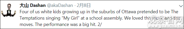 “我们4个在渥太华郊区长大的白人孩子,在学校大会上假扮‘诱惑乐队’(The Temptations,美国黑人合唱团),演唱了他们的歌曲《我的女孩(My Girl)》。我们喜欢这首歌和它的动作。表演非常成功。