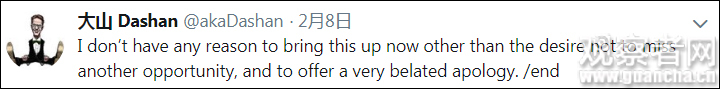 “我没有理由现在提起这件事,除了希望不要错过另一个机会,并表示迟来的道歉。”