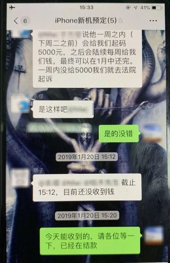 与项女士一同前来报案的大多是于某某的朋友、同学,遭遇与项女士如出一辙,很多人加了同一个微信群,于某某曾在里面兜售低价苹果产品,如今群里只剩一条条向其追讨钱款的信息。