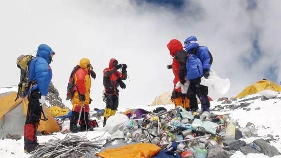 你随手丢弃的登山绳、空氧气罐、压缩饼干包装袋,可能需要清理人员冒着生命危险爬上险峰才能清理……