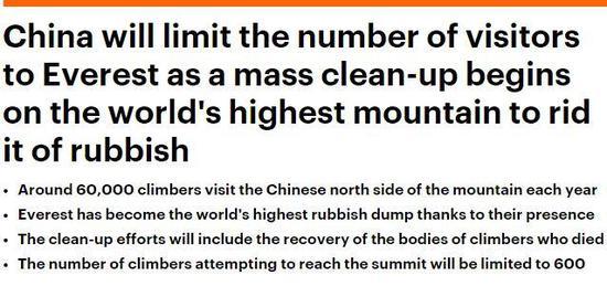 ▲China will limit the number of visitors to Everest as a mass clean-up begins on the world‘s highest mountain to rid it of rubbish (via Daily Mail)