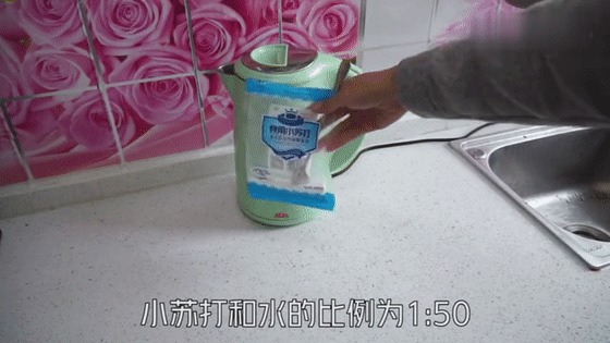 小苏打除水垢: 在用水壶烧水时,放一小匙小苏打(比例为1:50),烧沸几分钟,水垢即除。