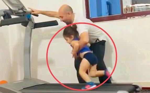 不过,老爸设定的速度实在是太快了,小娃的跑步速度还达不到,尽管小娃拼尽全力的在跑,还是慢慢的在往后退,老爸呢在一旁不断的加油鼓劲儿。当宝宝实在是没力气的时候,快退到跑步机边沿时,老爸一把抱住了宝宝,并去关掉了跑步机。老爸这样提高孩子的跑步速度,看起来也很有效果呢。宝宝身上的肉肉看起来很结实,不是虚虚的赘肉,而且跑步时胳膊和腿部的配合也相当的协调,一看就是经过专业训练的。