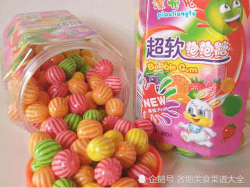 西瓜泡泡糖:西瓜泡泡糖是所有糖果中的王者,80后,90后朋友童年最爱吃的一种零食了,西瓜泡泡糖看起来就像一个个迷你小西瓜,每一种颜色代表一个口味,每次买的时候都要挑选自己喜欢的颜色。