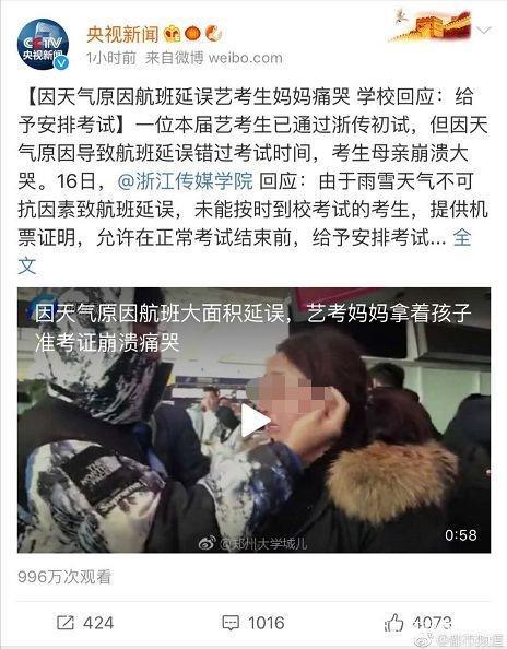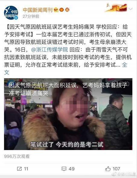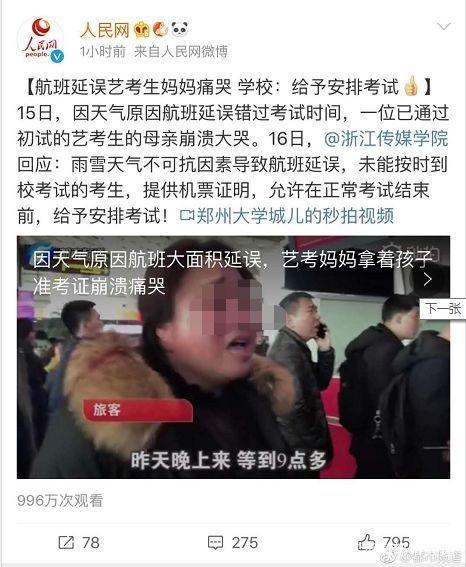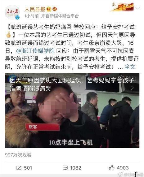 [分享]航班临时取消 艺考生妈妈拿着孩子准考证崩溃痛哭
