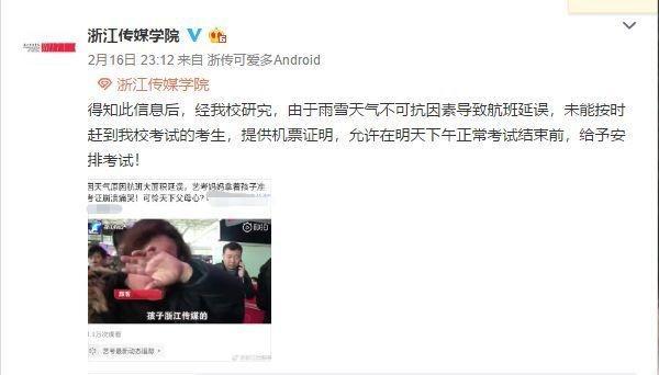 得知此信息后,经我校研究,由于雨雪天气不可抗因素导致航班延误,未能按时赶到我校考试的考生,提供机票证明,允许在明天下午正常考试结束前,给予安排考试!