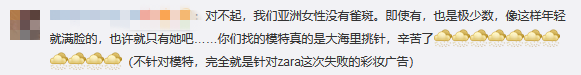 部分网友认为,ZARA刻意丑化亚洲女性,而且把中国模特拍得很不精神。“难道亚洲女性就要满脸雀斑?”“模特拍成这样是想哗众取宠吗,还是在丑化亚洲人?”