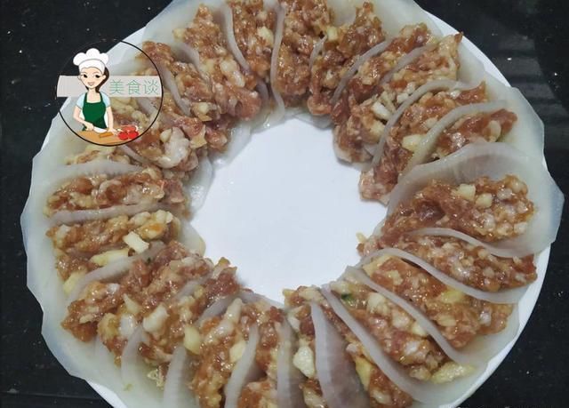 6、把萝卜片在碟子里围成一个圈,逐个加入适量肉糜。也可以用萝卜片包裹着肉糜,然后摆盘在盘中,怎么方便怎么来。