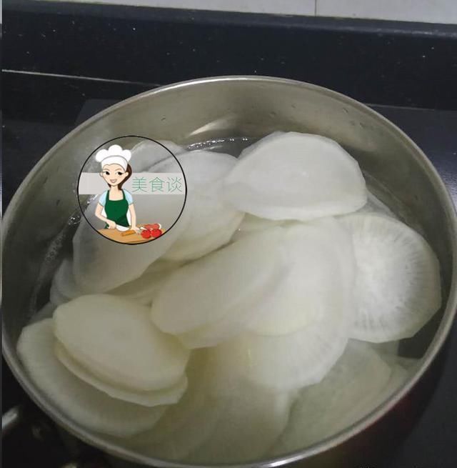 3、锅里加入适量的清水,大火将煮煮开,将白萝卜片下锅焯水变软即可捞起。可以加入少许盐一起焯水,这样萝卜片更入味一些。(萝卜焯水后变软这样在包裹肉馅时不容易断开)。