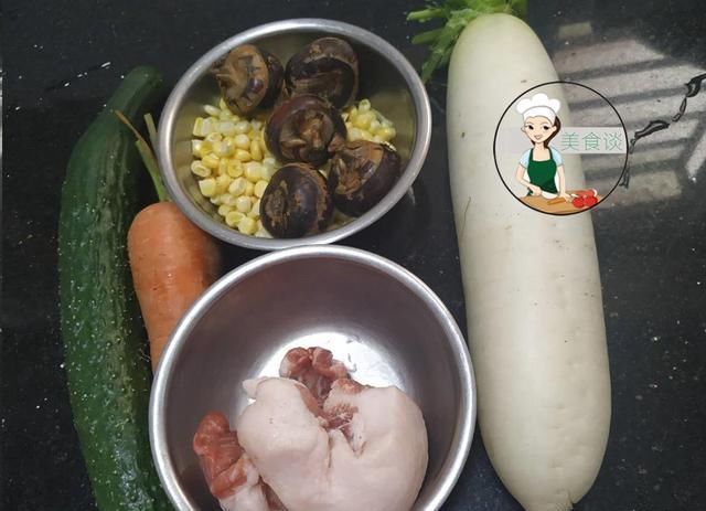 准备食材:猪肉适量、白萝卜一根、玉米粒适量、马蹄5个、红萝卜一根、青瓜一根。配料:油盐适量,酱油、蚝油、一勺料酒、半勺糖、盐、适量胡椒粉、一勺生粉。