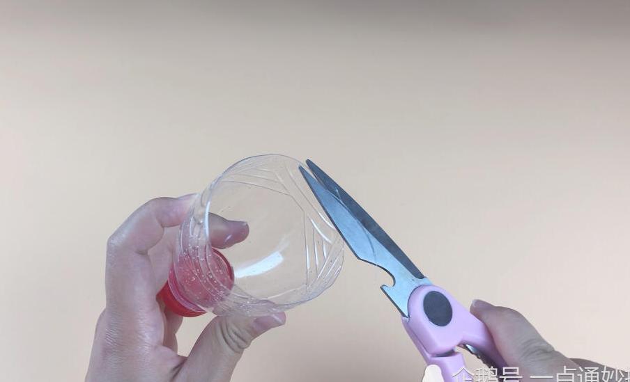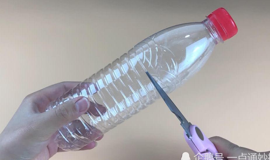 首先,我们准备一个圆形的塑料瓶,然后把瓶头部分减下来,减下来后再修剪一下,修剪平整放着备用。