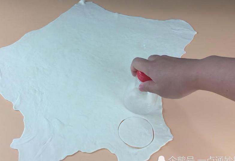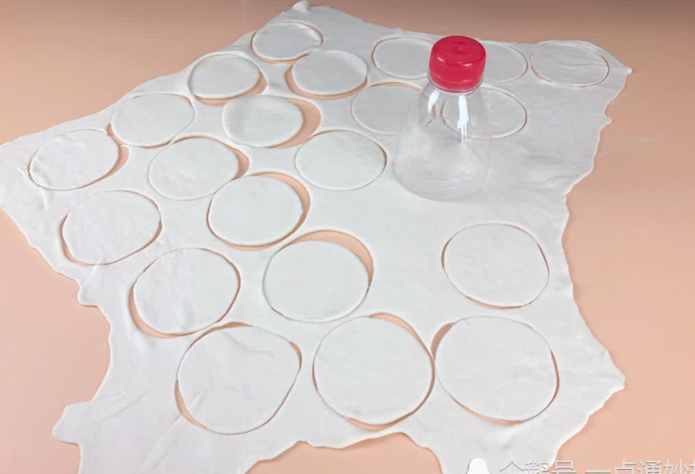 把面团擀成薄厚均匀的面皮后拿出准备好的塑料瓶,对着面皮轻轻按压一下,一个饺子皮就轻松完成了。我们可以一次擀一个更大的面皮,这样变成一次完成更多的饺子皮。