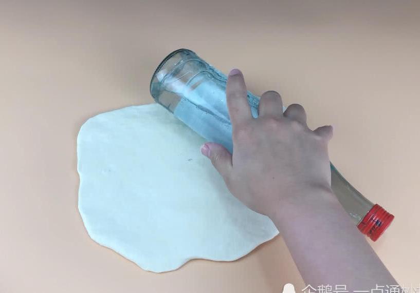 然后拿出揉好的面团擀成薄厚均匀的面皮,如果家里没有擀面杖,可以拿一个洗净的圆形玻璃瓶用来擀面皮也是非常好的。