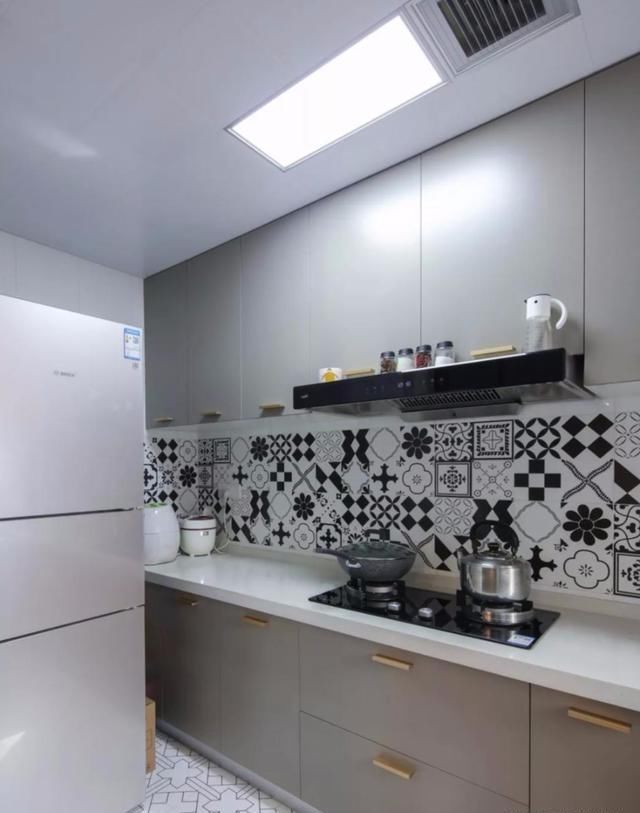 厨房内部是L型的橱柜,台面中间部门使用了花砖来增加视觉效果,台面是人造石英石的,很实用很结实,柜门的颜色让人看着就很舒适,简单的设计,通过简美的把手,散发着生活的本质。