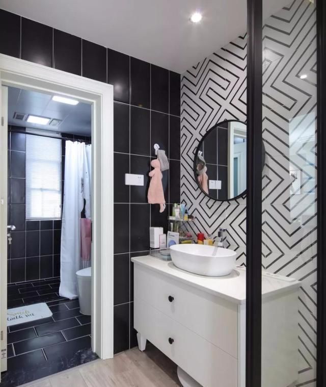 卫生间设计成了干湿分离,通过两种不同颜色的瓷砖来达到不同的效果,干区连接走廊位置,整体效果与外面连接的更加适宜,白色的洗脸盆旁边做出一个玻璃隔断,不仅隔水效果还很漂亮。