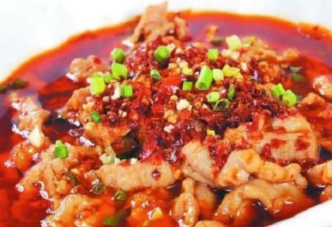 用剩余的植物油烧开,淋在肉片上,使热油把干辣椒,花椒粉,肉片再炸一下,就做好了。