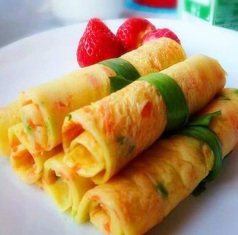 用比较难看的那面卷香肠,或者生菜,然后切成段。撒上黑芝麻点缀就好了。