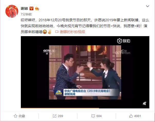 2019年2月19日上午11点20左右,谢娜在微博上发了一条喜讯:“哎呀嘛呀,2018年12月20号我录节目的那天,许愿说2019年要上新闻联播,这么快就实现啦哈哈哈哈。”