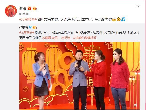 谢娜还特意提醒网友:今晚收看央视的元宵晚会,记得看他们的节目《快说,我愿意》,因为“演员娜”要来啦!其实在此之前,谢娜还发了一条微博宣传央视的元宵晚会。