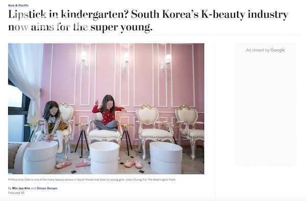 2月16日,美国《华盛顿邮报》一篇题为《幼儿园涂口红?韩国美妆业瞄准年幼女孩(Lipstick in kindergarten? South Korea's K-beauty industry now aims for the super young)》的报道引发韩国媒体关注。