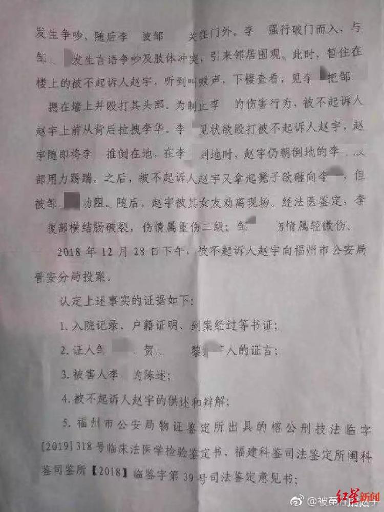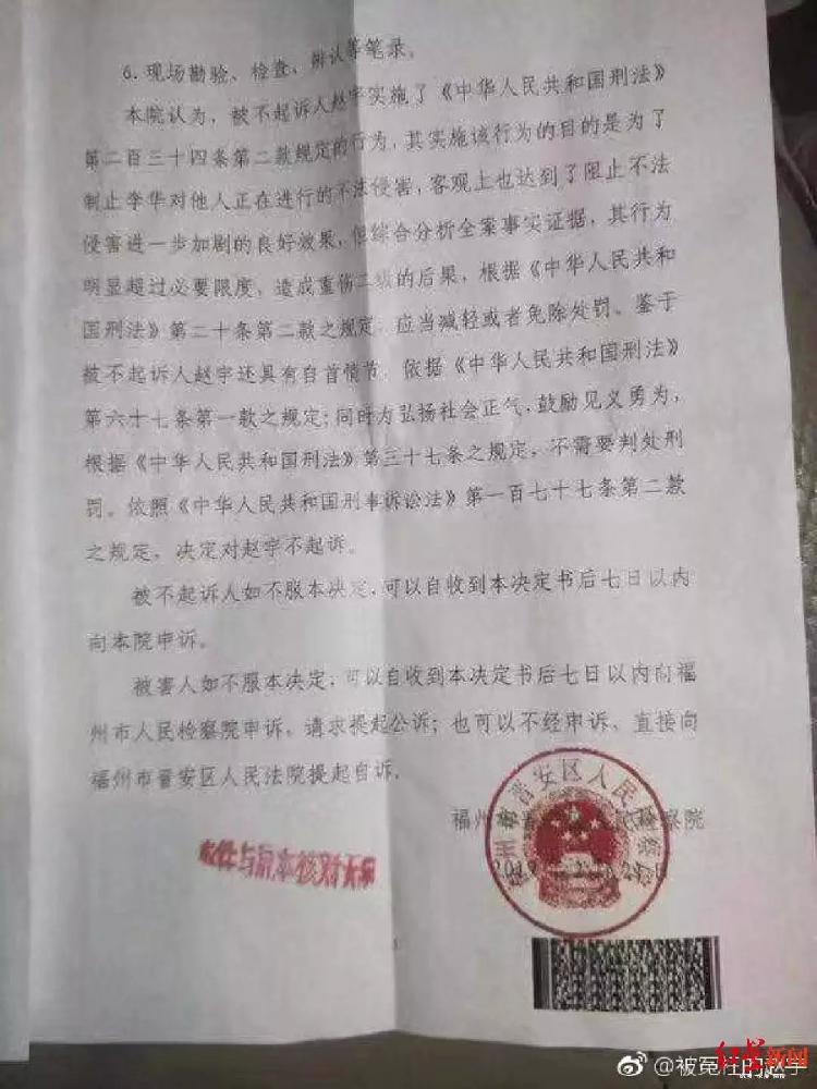 2月21日,晋安区人民检察院经审查认为,赵宇的行为属正当防卫,但超过必要限度,造成了被害人李某重伤的后果。鉴于赵宇有制止不法侵害的行为,为弘扬社会正气,鼓励见义勇为,综合全案事实证据,对赵宇作出不起诉决定。当天下午,赵宇来到晋安区检察院,拿到了《不予起诉决定书》。“心里总算松了一口气,但对里面的内容还是不太理解。”赵宇说。