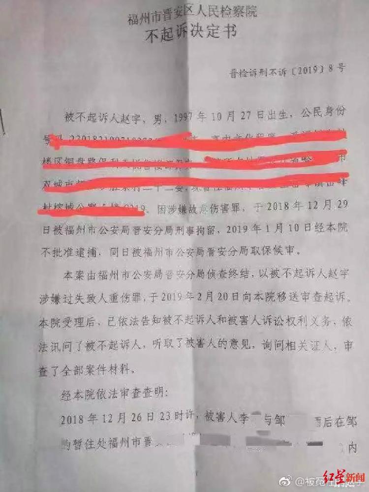2月20日,福州市公安局晋安分局以过失致人重伤罪将赵宇移交晋安区人民检察院审查起诉。