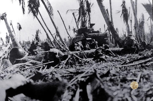 这张照片拍摄于太平洋战争期间,1944年6月美军步兵部队在坦克的支援下清剿比亚克岛残余的日军,日军步兵第222联队在该岛上进行了两个月抵抗。