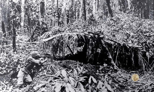这张照片拍摄于太平洋战争期间,1944年5月美军进攻瓦克德,沿着几乎被炮火夷为平地的椰林中谨慎地向日军的阵地推进。