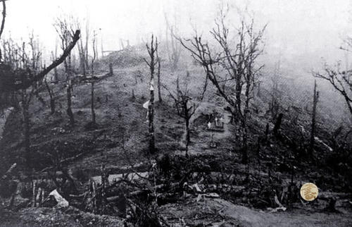 这张照片拍摄于太平洋战争期间,1944年5月科希马征地前线,一处遭英军火炮覆盖的日军阵地,现场一片末日景象。