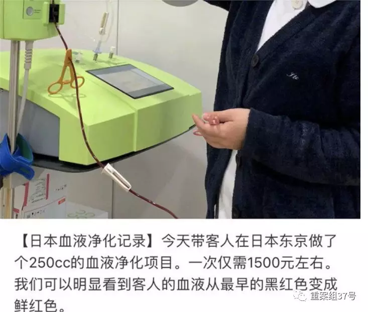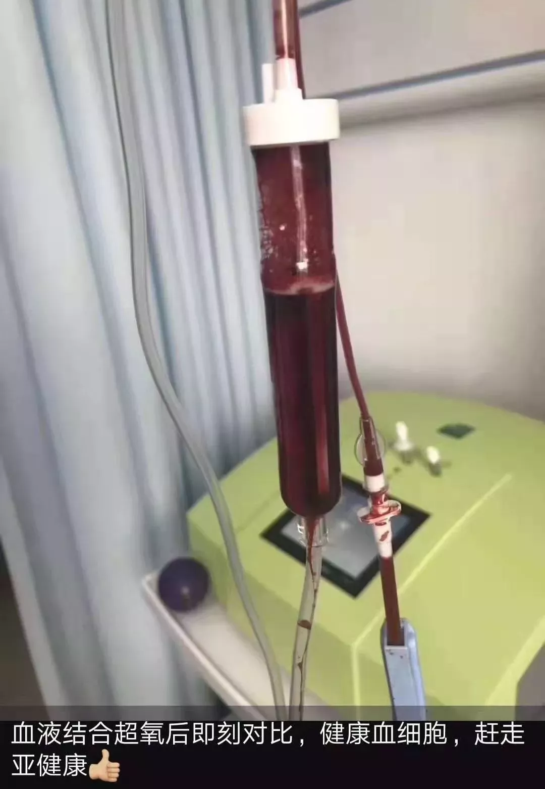 该网友称,抽出的100cc血,呈偏暗红色,注入臭氧开始净化后,血一下子变得鲜红。文中称,该项目促进新陈代谢,调节免疫力和帮助身体排毒。