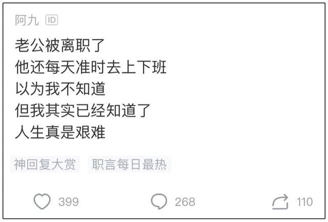 “老公被离职了,他还每天准时去上下班,以为我不知道,但我其实已经知道了,人生真是艰难”。