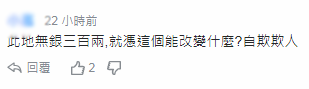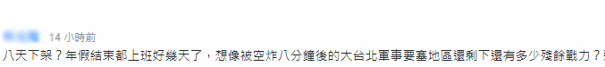 网友则对此事件讥讽称,台“国防部”反应慢半拍,“这东西曝光8分钟都嫌太长”。
