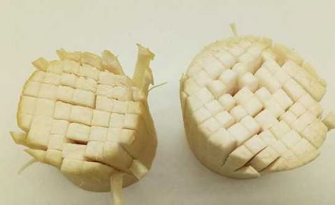差不多每隔2毫米左右给它切下去,一刀一刀地切,切完后转90度继续切,大概是上面是一根一根连着的小四方长条,这样子菊花花刀就切好了。