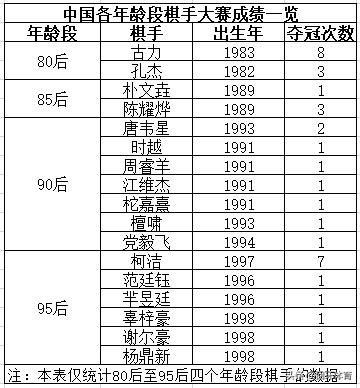 如今95后棋手成为了中国围棋最有实力的一批。在97年出生的柯洁领军之下,“98四杰”杨鼎新、李钦诚、辜梓豪、谢尔豪为中国棋手外战的主要有生力量,还有范廷钰和芈昱廷两大96年出生的,实力风头已经超过了唐韦星、时越等为代表的90后棋手。在杨鼎新夺冠后,95后棋手至今已经夺得12个世界冠军,超过80后一代(古力和孔杰合计11次)成为各大年龄段中夺冠次数最多的,90后棋手作为主力开启了2013年至今的“中国围棋盛世”,但柯洁等95后棋手却是这个盛世的最强音符。