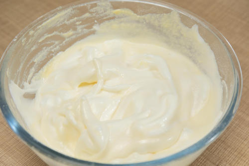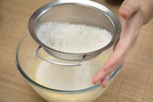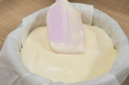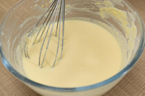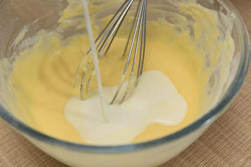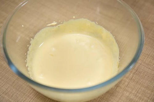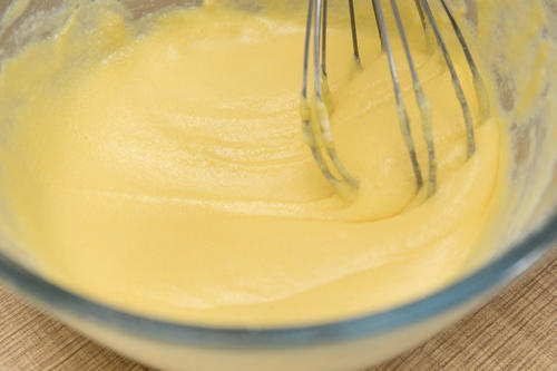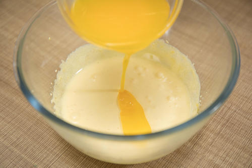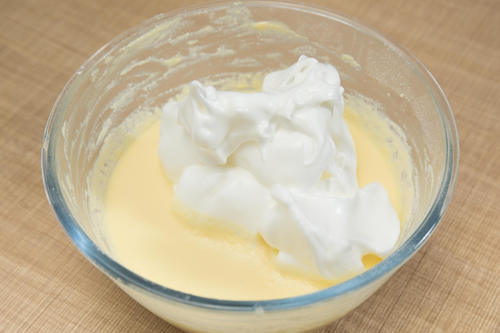 ①不完全混合蛋黄糊和蛋清。上层漂浮的蛋清会形成口感绵密的海绵状蛋糕,稍稍混合在一起的蛋糕糊就会形成中间部的奶油状,沉在底部的液体蛋黄糊烤完后就是布丁层。