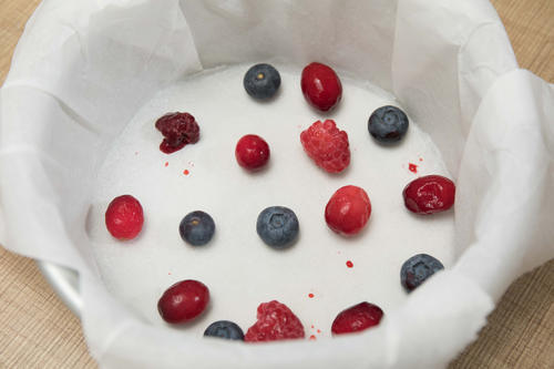 10、提前在铺好油纸的6寸模具中均匀地撒上80g莓果。我混合了蓝莓、蔓越莓、树莓这三种莓果。如果手头上没有那么多种莓果,也可以只使用一种,或者是不放。