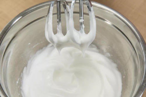 7、制作蛋白霜:分离好的蛋白加入2~3滴柠檬汁后,分三次加入25g细砂糖打发至硬性发泡,即提起打蛋头能拉出直立的小尖钩。
